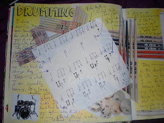 But today I was inspired. It was a lovely day and for once I wasn't busy with plans to dash off across the country to see friends or go to gigs, I had the day to myself. So I decided to go sit in the sun in a park and on a whim I decided to take a journal I have had for a couple of years from a swap which has been sitting on my windowsill for a couple of years since I moved to Cardiff. So I did some general sketching in my sketchbook my friend Ad bought me for christmas to motivate me to get back into art but so that it motivated him too. Then once I was settled I got out my coloured pens and the journal and for the first time really read the few pages that were already in there. And the thing that got me was Secret Terrabite's zine which is in there and tells the story of how she got into art and started on the journals and how this was no. 136. And reading it, I felt I had let her down, for still having the journal for not having worked on it and passed it on. But also it reminded me that art isn't about pressure to be a certain something or for someone else, but to just play with idea's and have fun. So the first page I did was an apology for her which still needs to be finished off. But the I just outlined idea's on pages of what I would want to do for pages. And by the end I had 8 or so pages of idea's. It was funny how easy they came and so it feels nice to be back in it, to have idea's flowing again. I wonder where everything has been going, what have I been doing with all my idea's and imgaination. And I am not sure, but it feels good to have it back.
